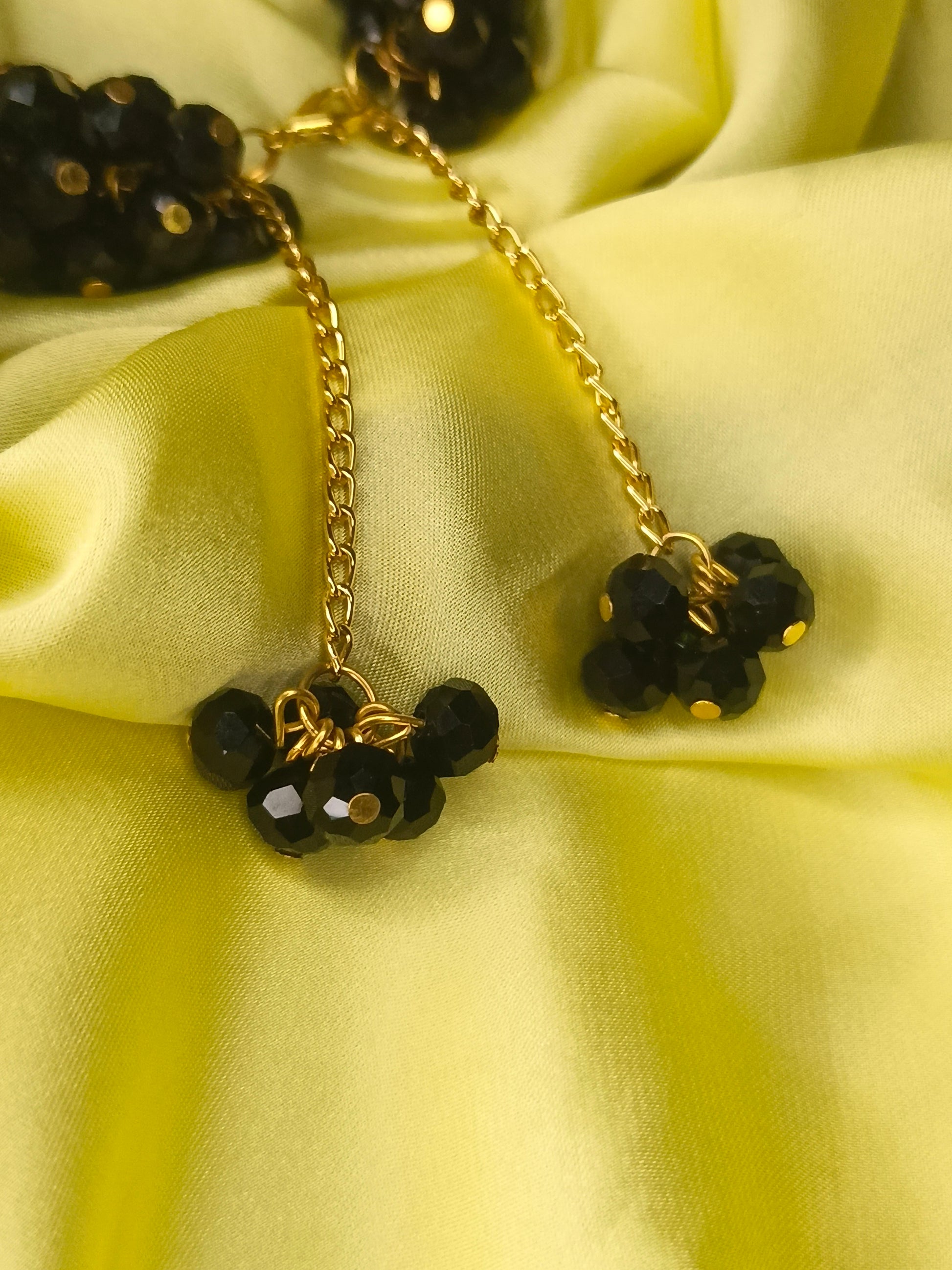 This handcrafted bracelet showcases a blend of timeless elegance and grace, inspired by traditional gajras. With premium black crystals and delicate golden detailing, it's the ideal statement accessory for any festive occasion, party, or daily glamour.