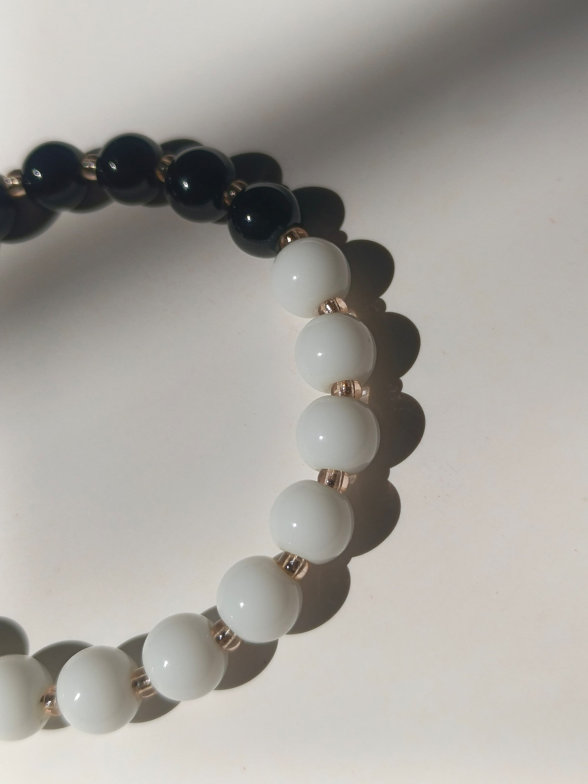 Step into elegance with the Midnight Glow Bracelet, a perfect fusion of mystery and grace. Crafted with sleek black and white beads joined by golden accents, this bracelet shines with timeless sophistication. Its contrasting tones make it a versatile accessory — perfect for elevating any outfit from daywear to evening glam.